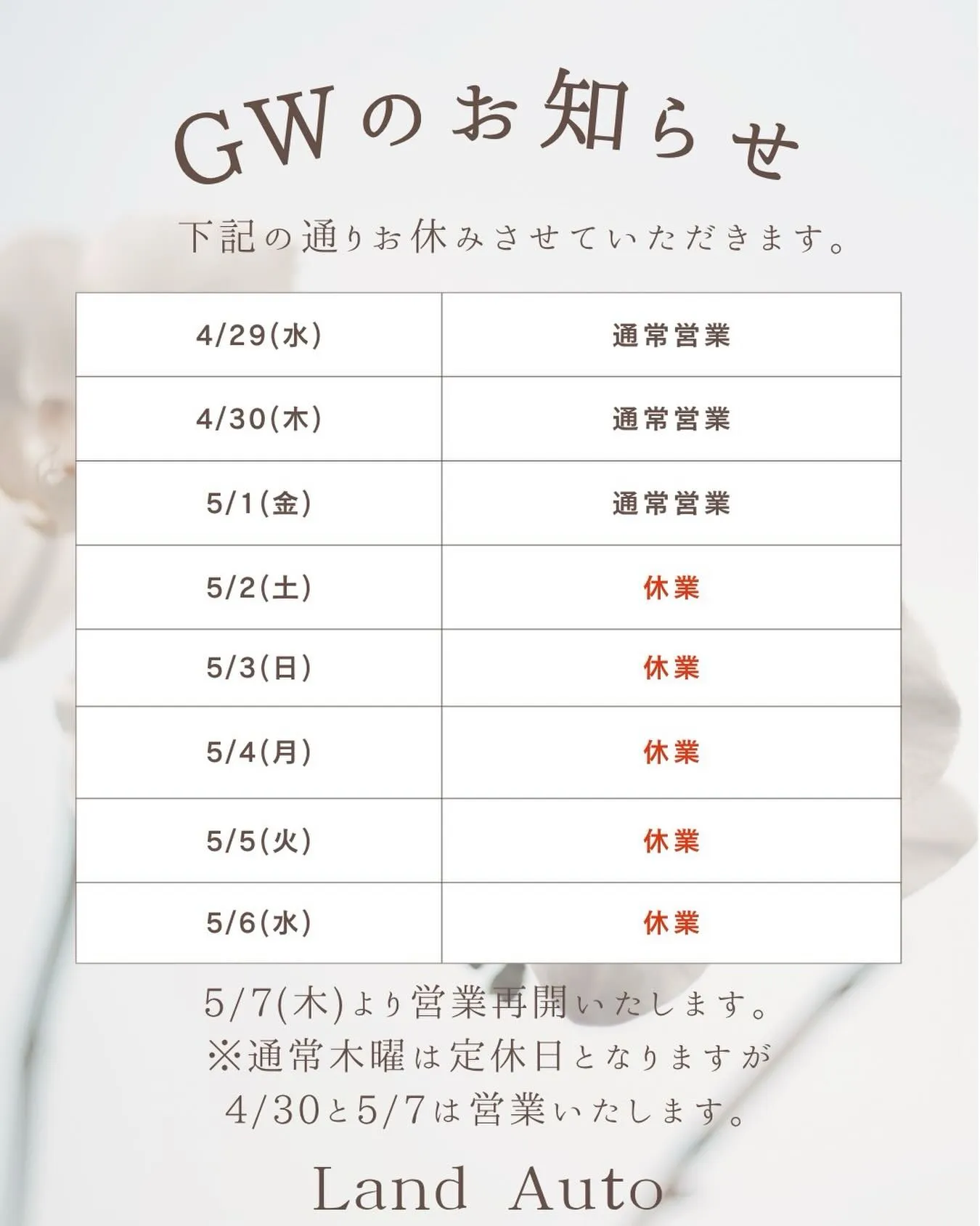 ※4月30日と5月7日は木曜日ですが営業いたしますのでお間違えの無いようにお願いいたします。